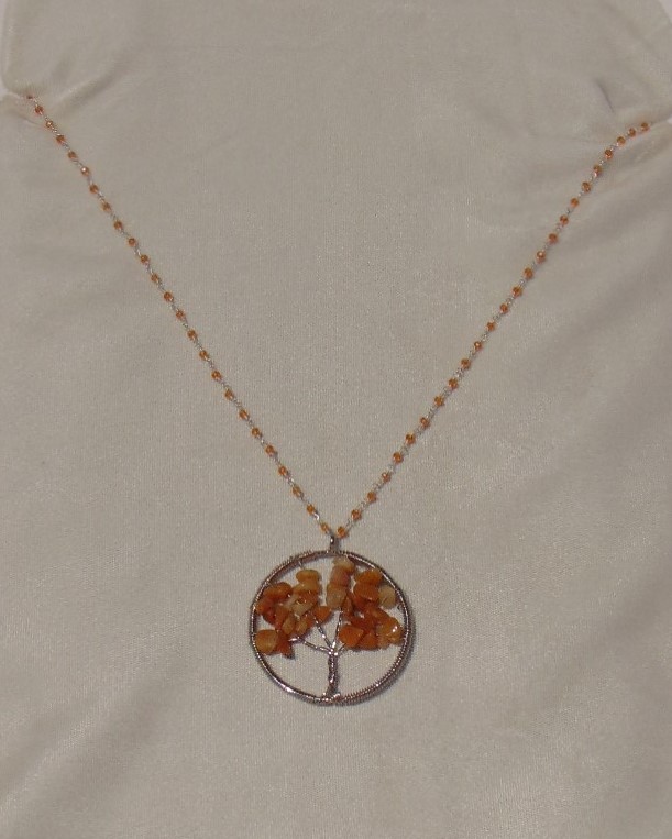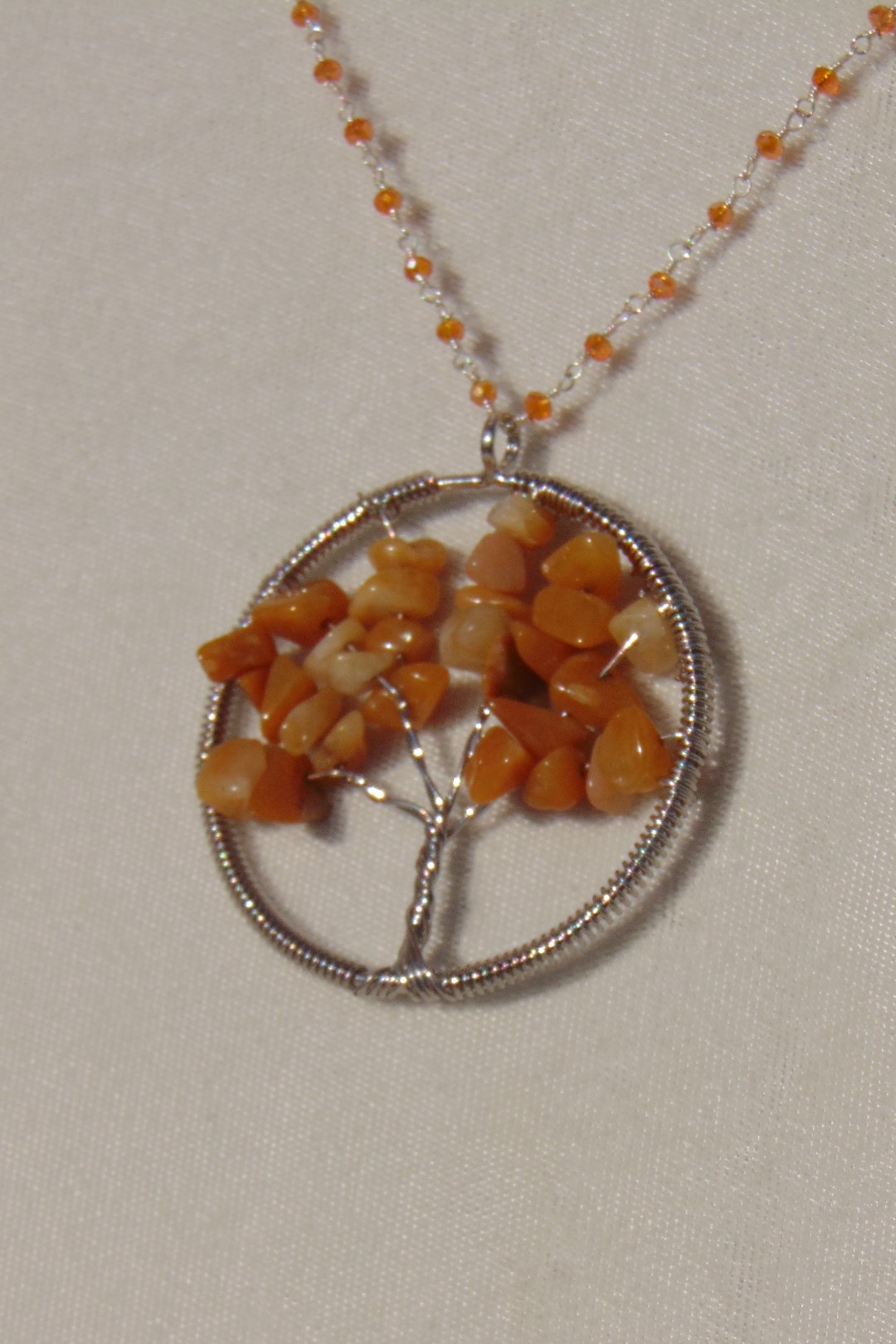 The Tree of Life represents the connection between the earth and heaven. This Tree of Life has pretty jasper stones and hangs from a silver-tone beaded necklace measuring 28″ long.